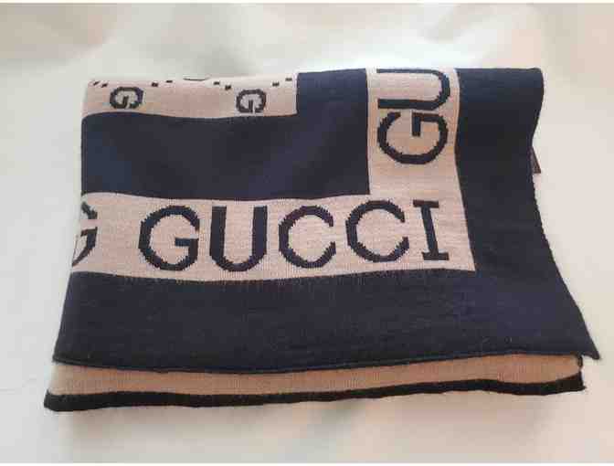 This is a large 69" x26" wool and cashmere like Gucci themed fabric scarf. Very nice! Camel and black. Whether its an original Gucci I doubt it as its not marked as such other than the fabric. If it is, you got a steal! Either way its a very nice and heavy scarf. Unused. Reversable.