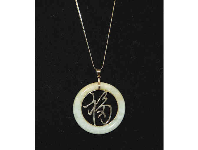 The circular jade pendant hangs from a 14K gold 18" chain. Within the circle of jade are Chinese characters.