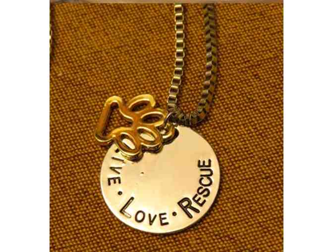 Show off your love of rescue with this silver tone Necklace with paw charm.  Sentiment 'Live...Love...Rescue' with a pawprint charm.
