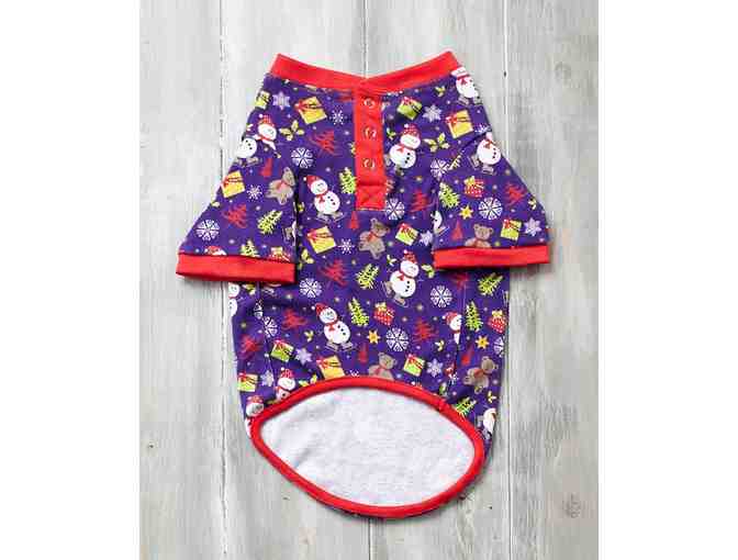 These adorable Christmas Pajamas for your furbaby will raise smiles whenever they wear them. They are purple with ice skating snowmen, Christmas trees, presents and more. Perfect for holiday photos.