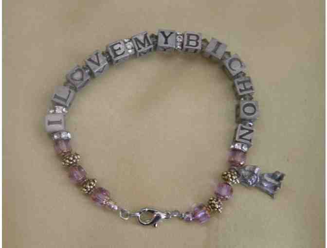 Amethyst glass and gold beads with crystal spacers. Pewter look square beads spell out "I LOVE MY BICHON". Wear this to keep your precious Bichon close when he can't be with you.