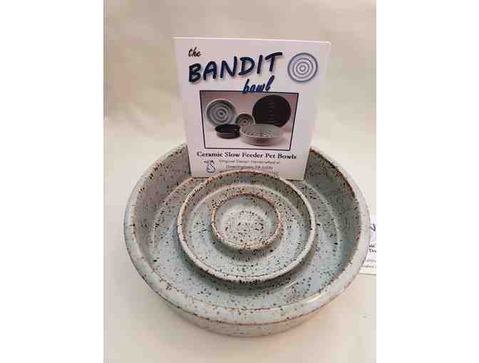 The Bandit Bowl for cats was designed specifically for your felined furry friend with interior and exterior walls that are more shallow than those designed for dogs. These bowls are about 1-1/4" tall and about 6" in diameter, with a bit more flare than our dog bowls. Tested and approved by hundreds of cats, these bowls will help your cat eat more slowly to avoid gastro-intestinal distress, vomiting and other problems associated with rapid eating. And, because I use the same glazes on my pet bowls as I do my people pottery, you can rest assured knowing that the surface your furever friend is eating from is safe, durable and easy to clean. No more harmful plastic toxins or potential bacteria growth in nicks caused by teeth and nails. With proper care, your Bandit Bowl should last for many, many years.