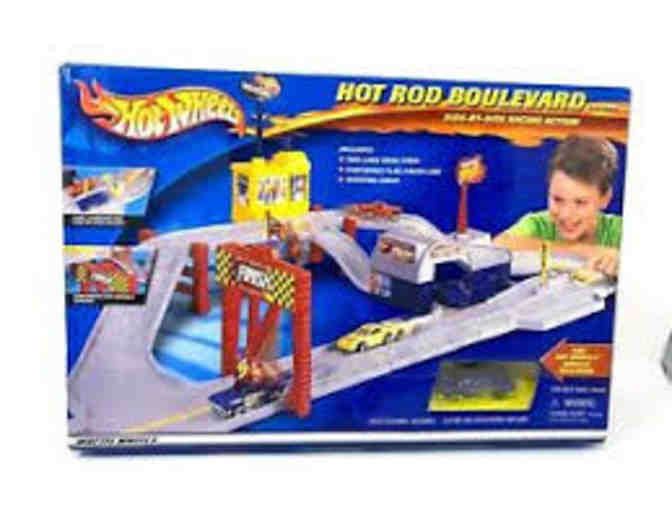 Hot Rod Boulevard features side by side racing action and includes two-lane srag strip, checkered flag finish line, and rotating diner. Includes one Hot Wheels vehicle!