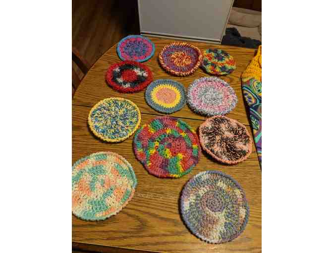 Perfect for gift giving. This auction is a set of 11 different crochet dish cloths. Multiple colored cotton and some made with scrubby yarn. Keep your dishes clear or share with a friend.