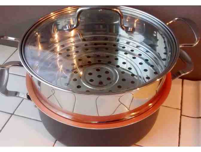 This lovely brand new non-stick pot is lined with a non-stick ceramic coating infused with copper. This sleek pot is crying out for the pastas and stews that you will make. It includes a lid, and a colander insert. Great for all your cooking needs!