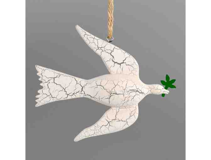 This charming white resin dove ornament with its crackle-look finish measures 4" from the green olive branch to the tail and 3 ΒΌ" from wingtip to wingtip."