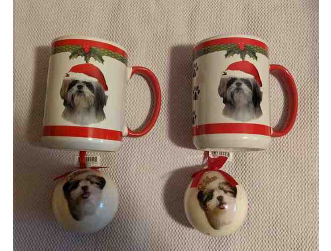 Get ready for the holiday season wit this set of two coffee mugs and tree ornaments. Sit in front of your tree this season sipping your favorite warm beverage while admiring these cute ornaments featuing your favorite breed.