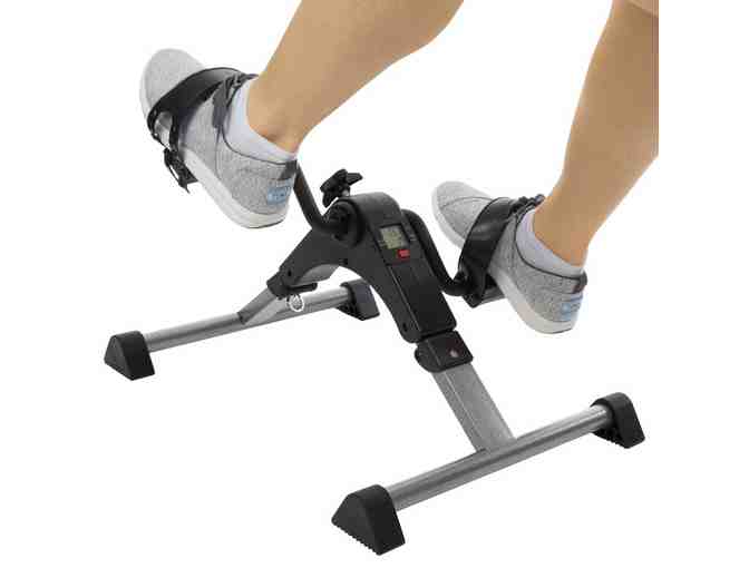 COMPACT FOLDING DESIGN FITS UNDER ANY DESK: Compact design is 9 ” high, easily fitting under a desk or similar space. Non-slip, nonmarking feet ensure the pedal exerciser stays in place on any surface, including any tabletop, carpet or hard floor surfaces. Each pedal also has a nonslip surface with adjustable toe loops for added comfort and safety. Legs fold under for compact storage and easy portability.