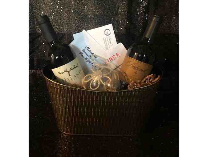 This "date night" basket contains 2 half bottles of wine and restaurant gift cards for a night out to Biaggio's in Paramus, Mahwah Bar and Grill in Mahwah, and Finca in Ridgewood.