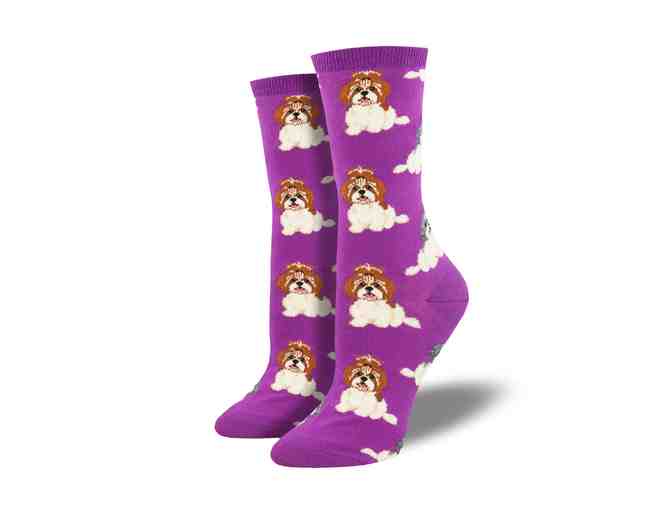 I Shih Tzu not, these women's Shih Tzu dog socks are adorable! Originally owned by Chinese royalty, the Shih Tzu has now become one of the most popular dogs in the world. The pups on these socks have charming topknots and sweet lion faces. Smile every time you look at your feet when you wear these purple mid calf socks with adorable Shih Tzu images