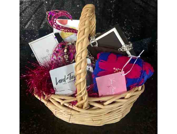The perfect gift for any fashionista! This basket includes a Vera Bradley scarf and sock set, a sterling silver necklace, beaded bracelet, a few beauty products, and a $50.00 gift card to Lord & Taylor.
