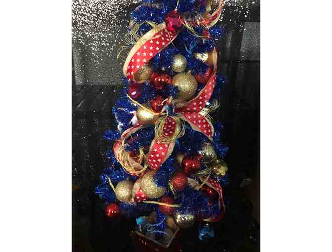 Decorate your home for the holidays with this fierce Wonder Woman themed (approx. 4 ft.) tree, complete with red accents, gold "lasso" detail, signature crown, and Hallmark Wonder Woman ornaments.