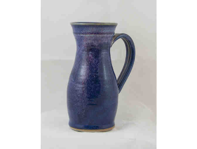 Hand thrown blue ceramic vase with glaze varying from deep blue to pale lavender. Nicely balanced with a handle. Condition is excellent. Would make an attractive decorative piece or look lovely on a table with a small floral bouquet.
