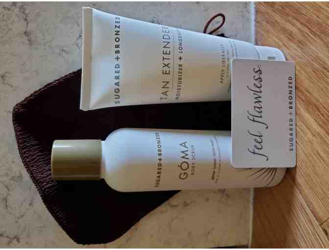 Gift pack includes 1 bottle Góma (body scrub), 1 tube Tan Extender, 1 mitt and a $39 gift card to Sugared+Bronzed. Gift card valid at any location. SUGARED + BRONZED was founded on the concept that hair removal and spray tanning shouldn’t be services found at the bottom of a long spa menu, done in the back of a salon, performed by a “specialist” who is expected to specialize in a laundry list of beauty treatments. We pride ourselves on the fact that we only focus on sugaring and airbrush tanning, all day everyday! Our estheticians and technicians are all trained in house to ensure you leave with smooth skin and a flawless tan, no matter the location, sugarista, or sprayer you visit.