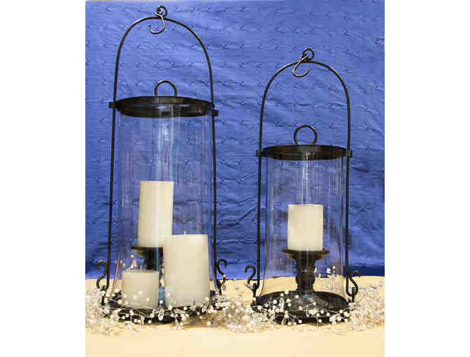 Dramatic in size; simplistic in design. This elegant pair of hurricane lanterns will warmly illuminate your living space, whether set on a serving table or hearth, or hung as a sconce. With a simple change of candle colors or styles, these will delight in any season.