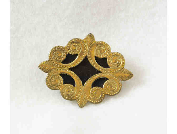 For someone who enjoys having a small piece to accent a jacket, scarf, or hat. Fun detail on gold tone metal scrollwork. Back is marked Swiss made.