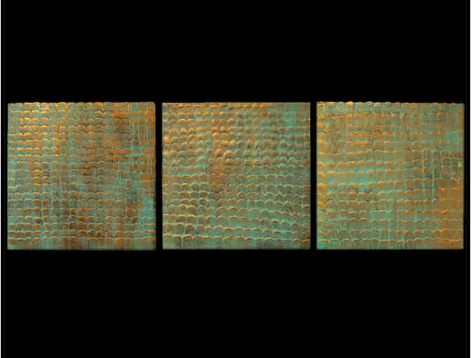 This amazing Triptych of Copper Fish Scales is dramatic in size and technique. Each piece is 18" x 18".