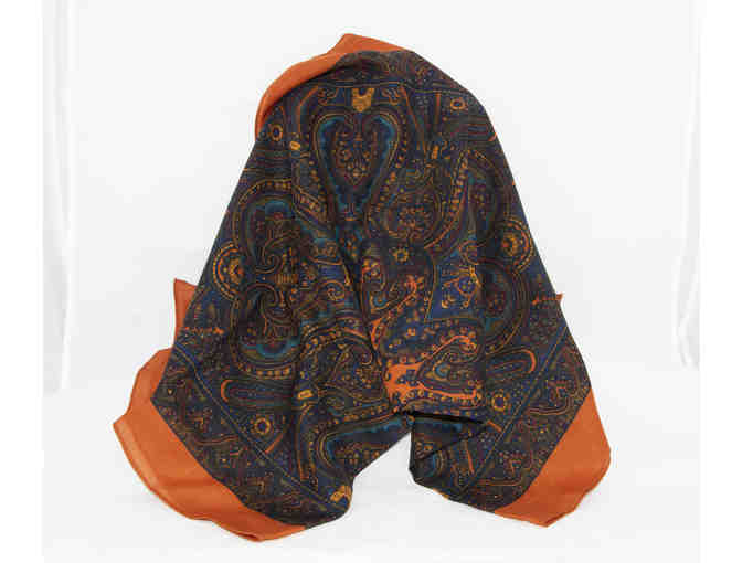 In the 1980s, scarves took a leap to the front as fashion accessories for women. Major designers world-wide launched lines of scarves, as did Dallas-based designer, Ginnie Johansen. This new, never been worn scarf by Johansen, was made in 1987. The dark brown and black paisley design has teal, green, and cinnamon accents, and a cinnamon border. Made of 100% wool.