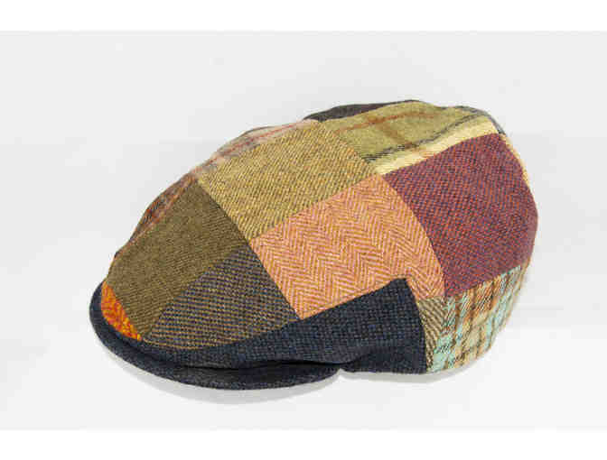Woven in Ireland by John Hanly & Co. LTD. This Irish tweed patch cap is made from swatches of wool in warm shades of orange, umbre, olive, and brown with a brim of heathered navy. The patch cap came to be in times where each piece of wool, whether a scrap from a suit or a unworn piece recycled from a garment, was put to good use. Cap is marked a men's size 7 3/8, 60, and L. New, never worn.