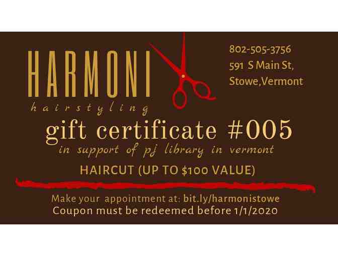 Haircut and styling for up to $100 value. Harmoni offers haircuts, henna, coloring, styling (of hair), and blowdrying.