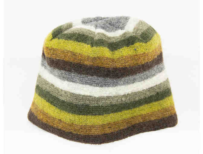 Striped in earthy tones of brown, green, gray, and cream. 100% wool cap made in Italy by Pistel. Fleece-lined over the forehead and ears for comfort. New, never worn. Unisex; measures 20" in circumference and 8" high.