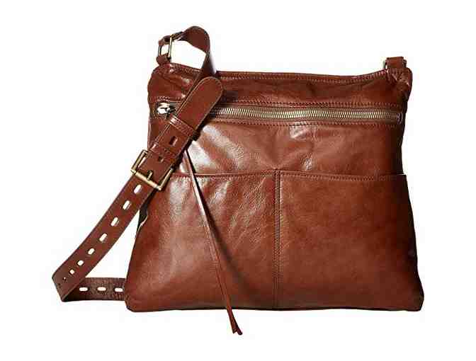 This genuine leather crossbody bag has a zipper closure, adjustable strap, two exterior front slip pockets, and an exterior back slip pocket. The interior provides a handy zipper pocket, another slip pocket, and beautifully printed polyester lining. The bag measures 12"H, 13"W, 1-1/2"D, and the strap length is a very adjustable 48 inches.
