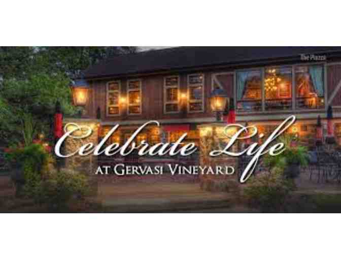 The mission of Gervasi Vineyard is to provide the total winery experience. Gervasi offers a memorable destination for local wine lovers, diners, families, businesses, and tourists who enjoy the few special places where beauty, tradition, comfort, and appreciation for good wine and food connect. Gervasi is designed for adults seeking an affordable, fresh and romantic dining experience by night; families seeking outdoor beauty, fun, and great food by weekend; and corporate teams looking for a unique meeting setting by day.