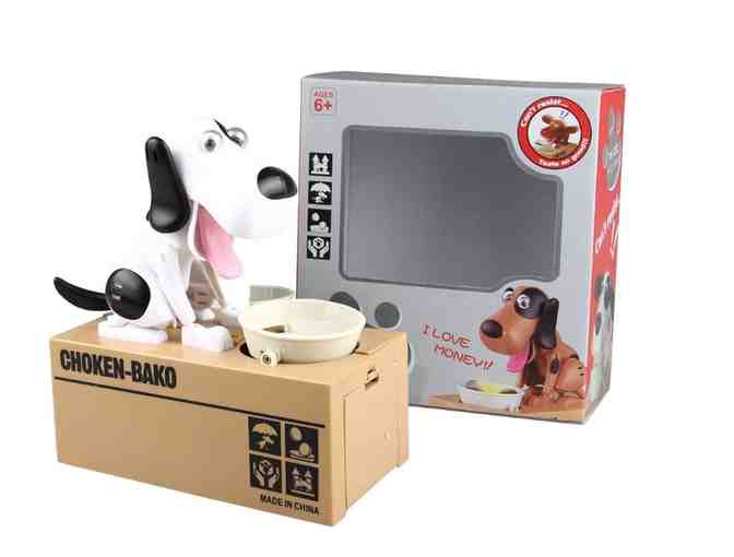Everybody has a spot that they dump their pocket change - make it fun with this robotic coin bank. Drop your coins in the dish and watch the dog eat up your change.