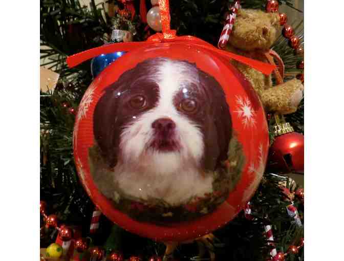 Celebrate your furbaby with this bright and festive holiday ornament. The little black and white Shih Tzu puppy's face is on a 2.5" diameter, unbreakable, bright red ball. Ribbon loop for hanging, gift boxed.