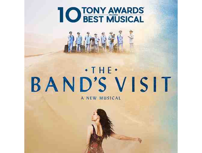 This auction certificate provides two tickets to The Band's Visit on Tuesday evening, March 17, 2020, at the Hippodrome Theatre. It includes a swag bag of theater memorabilia: On Your Feet CD, Phantom of the Opera pen, The Lion King beach towel, The Waitress pie book, Dear Evan Hansen knit hat, Gentleman's Guide to Love and Murder mug, Miss Saigon key chain, and Aladdin lamp, all in a handy Phantom tote.