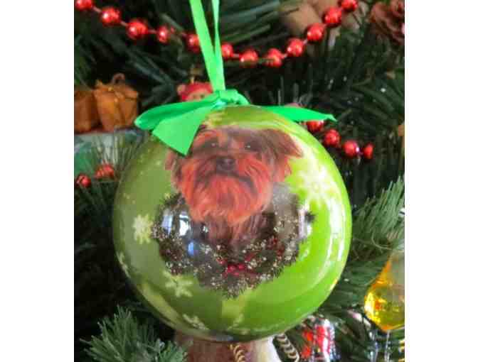 Celebrate your furbaby with this bright and festive holiday ornament. The little Yorkie's face is on a 2.5" diameter, unbreakable, bright green ball. Ribbon loop for hanging, gift boxed.