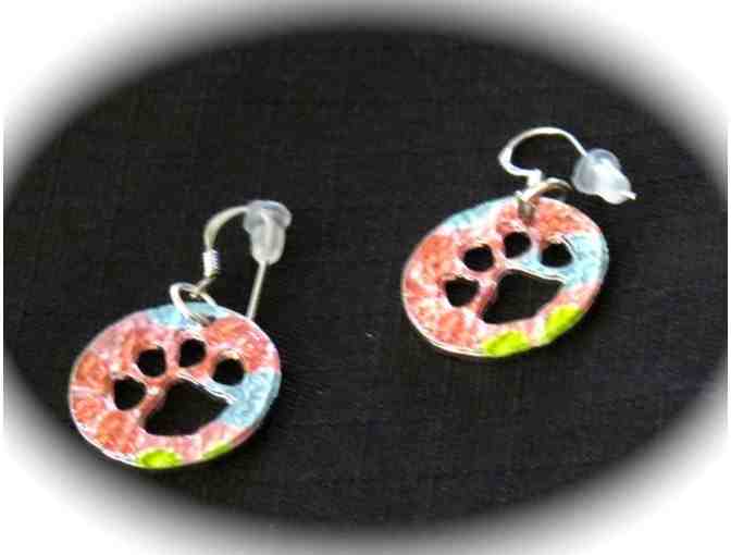 Silver plated drop earrings with hand painted multi colors surround a punched out paw print.
