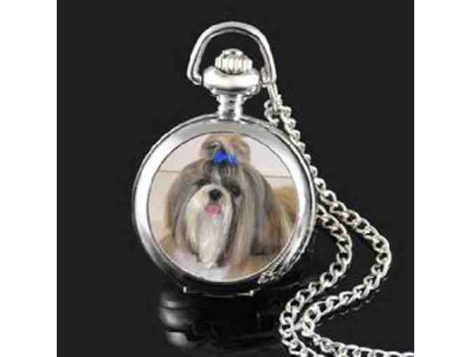 29.5 inch stainless steel chain. Watch diameter 1-1/8 inch. Enamel image of Shih Tzu on front of case. Watch with mirror on the inside, picture can be placed over mirror in pendant. High quality Japanese Quartz Movement, battery included.