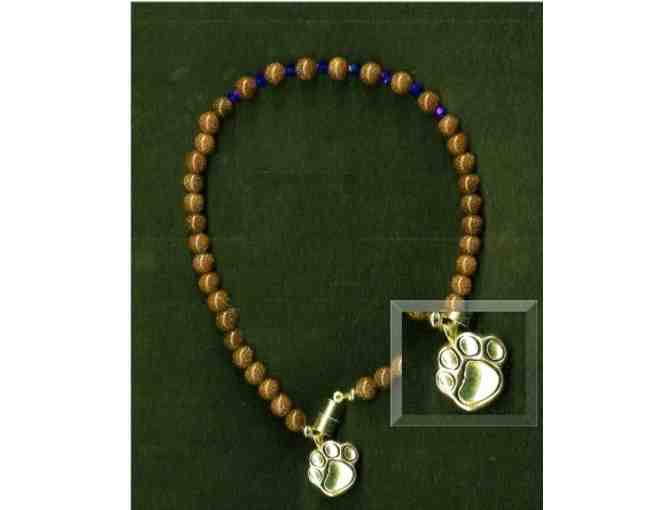 This 11 inch dog necklace is hand crafted of genuine Goldstone and Azure Swarovski crystals with a stunning paw print charm and a very strong magnet clasp. With this clasp, the necklace stays put around the neck but will break away if need be so the little lady won't get hung up.