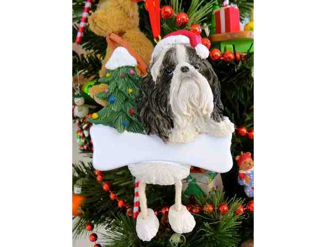 Your tree will reflect the love you have for your Shih Tzu with this gorgeous ornament.  Resin ornament features a Black and White Shih Tzu with dangling legs on a white bone.  You can personalize the ornament with a sharpie and your baby's name.