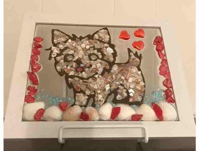 Handmade Sea Glass Window consisting of 8" x 10" white wood frame, sand, shells, glass and other embellishments. Colors are brown, beige, red, light blue and cranberry. Will provide screw eyes and cord to hang if desired.