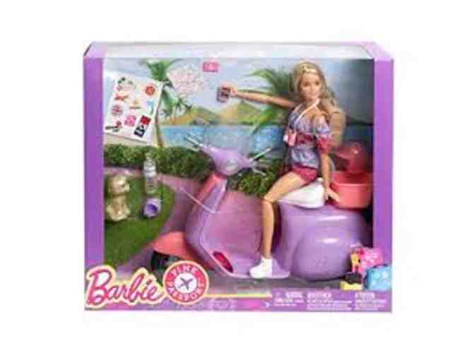 Send Barbie doll and her puppy scooting anywhere around the world with a pink passport and their scooter -it's equipped for a road trip into imagination with stickers and accessories to keep it on the path to fun!