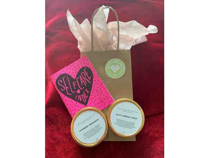 Spa Set from Threefold Gifts boutique in Lakewood. Set contains two scented Sweet Dish & Darling Travel Candles and a Self Care Index Pocket Guide.