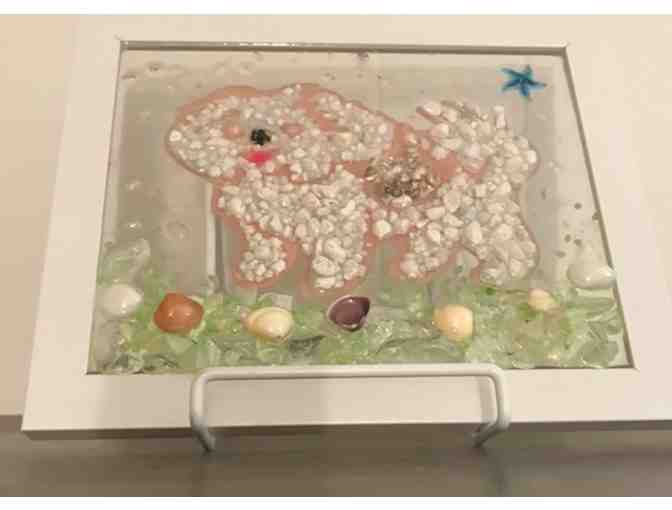 Handmade Sea Glass Window consisting of 8 " x 10" white wood frame, sand, shells, glass, starfish and other embellishments. Colors are