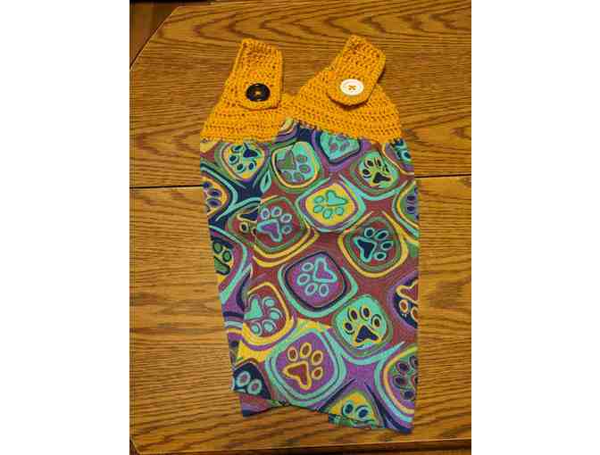 Crocheted Paw print towels. Perfect for hanging off the handles in your kitchen. Colorful pawprints in aqua, burgundy, yellow and green.