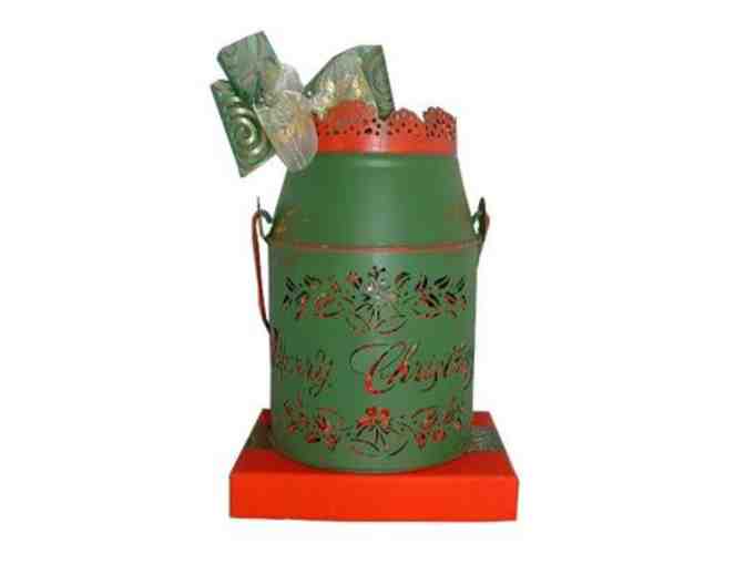 This auction is for a Christmas Lantern with 24 oz of goodies from Marie's Candies in West Liberty. This red and green metal decorative lantern is an elegant gift, as it shows off a "Merry Christmas" message to have this holiday season. It comes filled with delicious seasonal treats including: