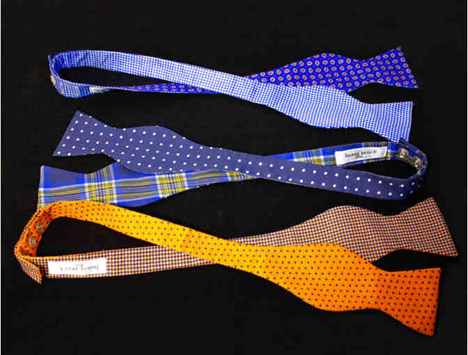 An orange dot that reverses to orange and navy check; a blue foulard that reverses to blue check; and navy dot that reverses to soft navy/mustard plaid; all silk and made in Italy. They are the perfect accessories for the natty dresser...you know the one...he ties his own bow tie! There are buttons in the back so the fit is right and once tied, the wearer wouldn't have to re-tie. This button configuration makes it possible for someone who has a friend who can tie a bow tie a candidate for this great item!