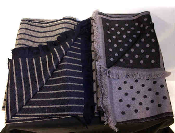 One has dots and one has stripes, but each is 64" X 14" and reversible in shades of grey and black. One is 100% fine wool and the other 80% wool and 20% cashmere and both adorned by subtle fringe on each end. They were made in Italy by Daniel Dolce.