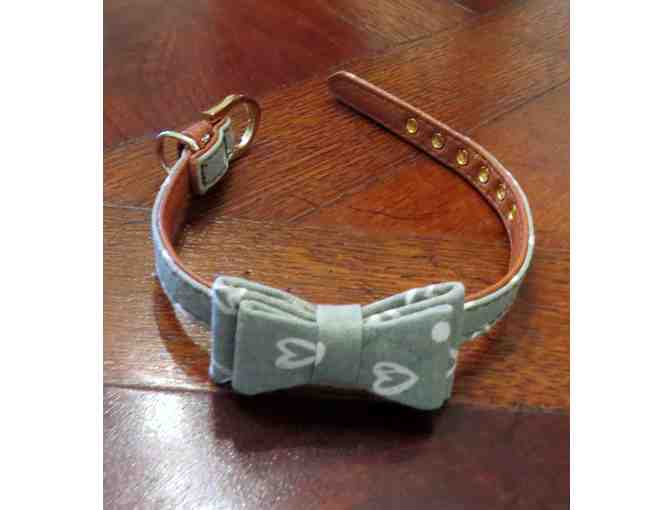 Your little one will be turning heads with this grey and white dog collar with a bow featuring little hearts. Faux leather back and brass buckle with a loop for attaching a leash.