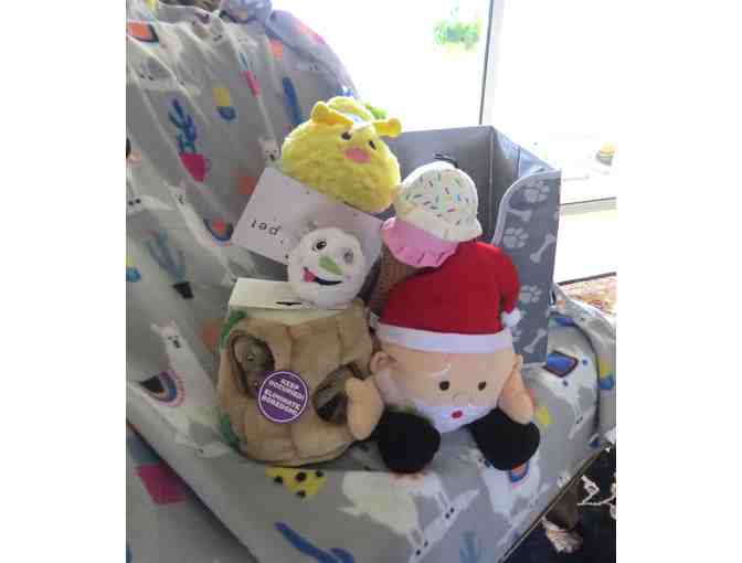 Includes a Hide-a-Squirrel puzzle toy, a fat Santa face, a fluffy caterpillar, an ice cream cone, and a fuzzy, funny ball.