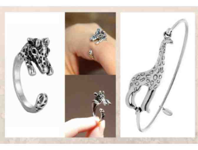 Adjustable, silver giraffe ring and silver giraffe bracelet.