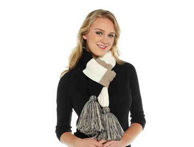 So warm and soft! A beautiful tassel scarf in colors of black, beige and ivory.