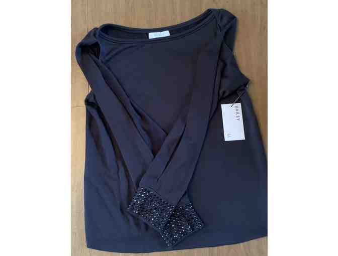 Dress up or down with this Bailey 44, Women's 'Don't Leave Me This Way' Black Sweatshirt adorned with black beading on the cuffs of the cut-out sleeves.