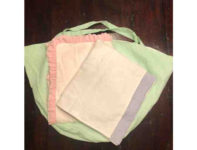 Splish Splash - enjoy this adorable green seersucker beach bag and two beach towels - one pink seersucker and one blue seersucker! All items to be monogrammed with your choice of design by Sew Stitchin' Fancy!