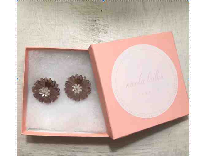 Post floral earrings in ameythst color and pearl in-lay by Nicola Bathie